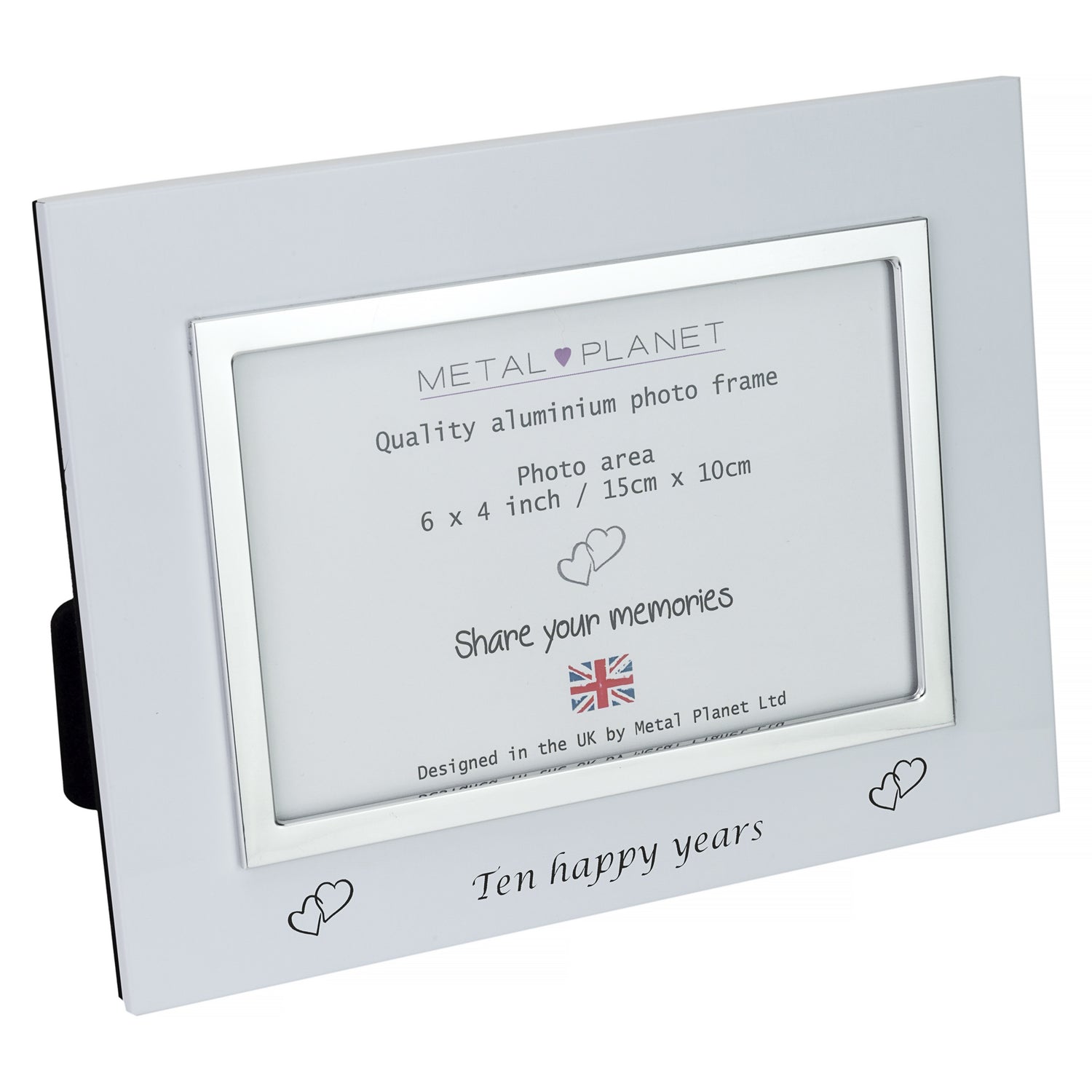 This gorgeous white coated aluminium photo frame has a 'Ten happy years' message with a sketched double heart on either side. Contemporary in design, this lovely frame will blend perfectly with any decor.