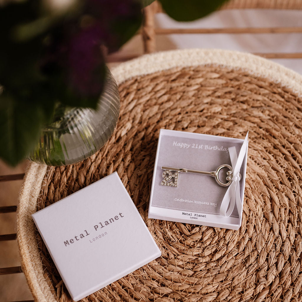 The key is attached to a smart grey card and has a lovely white satin ribbon tie. The key can be easily removed and then added to perhaps a keyring or kept as a special keepsake to remember an amazing 21st birthday celebration!