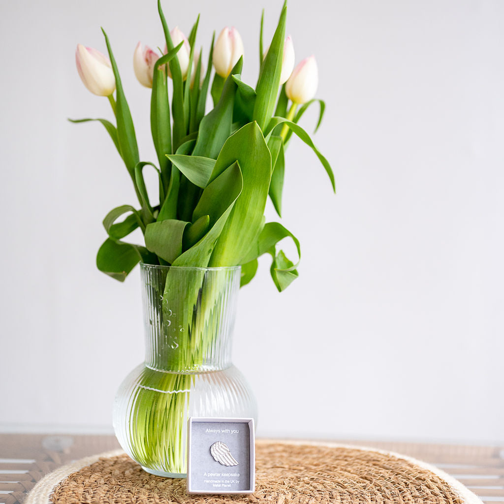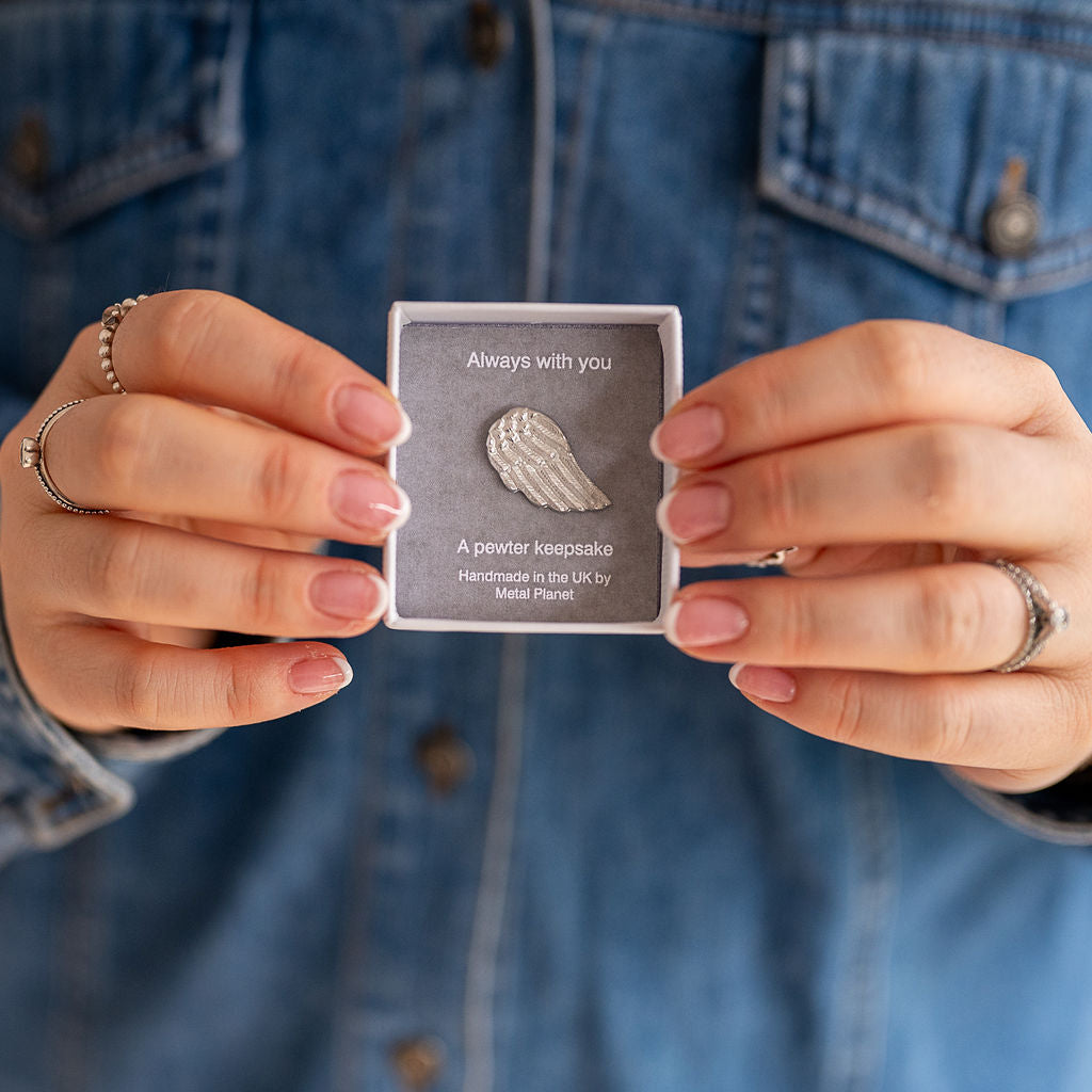 This cute pewter pocket token features a little pewter feathered angel wing secured to a dove grey printed card saying 'Always with you'. A beautiful sentiment for so many occasions, for comfort, love, companionship, travel ... Simply detach the little angel wing and keep it safe in a purse, pocket or wallet.