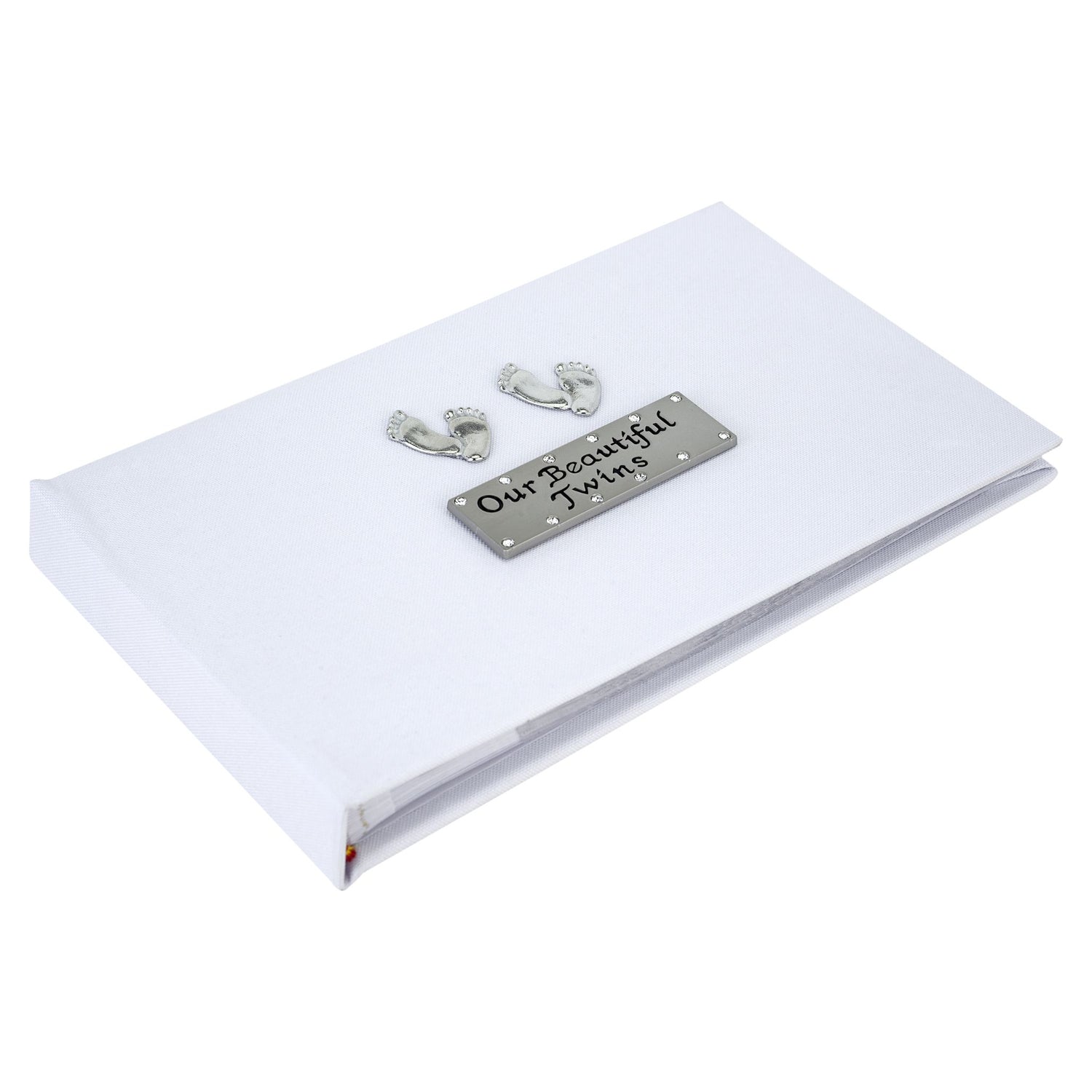 A gorgeous design of double footprints (double trouble!) set above a sparkling design saying 'Our Beautiful Twins' set with little diamante stones around the edge. This design comes in a choice of 3 photo album colours - baby blue, baby pink and neutral white.