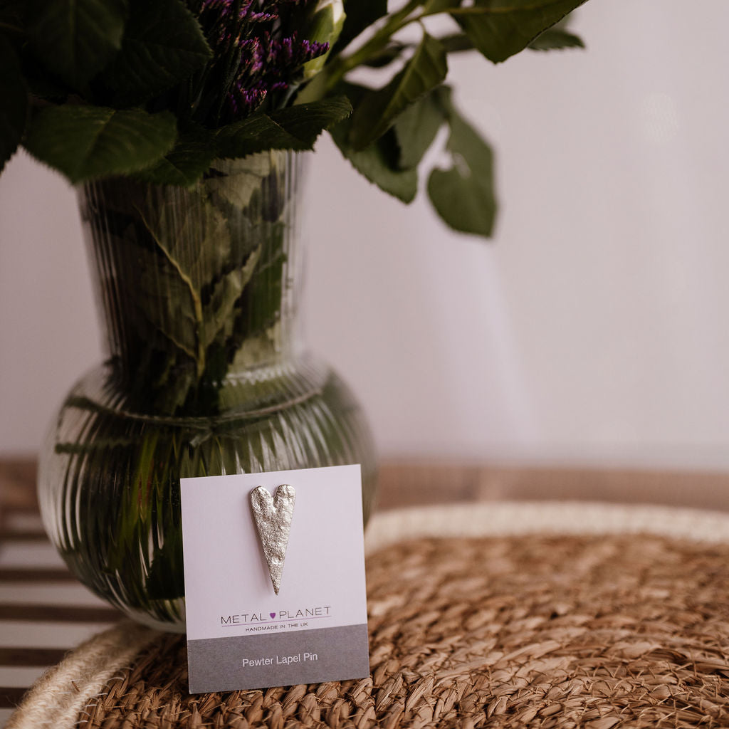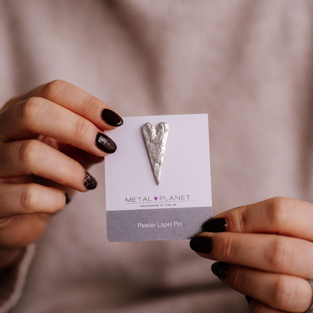 Easy to use pins with a little push pin back and fastened to a smart dove grey Metal Planet display card. Easily pushes onto your lapel or scarf.