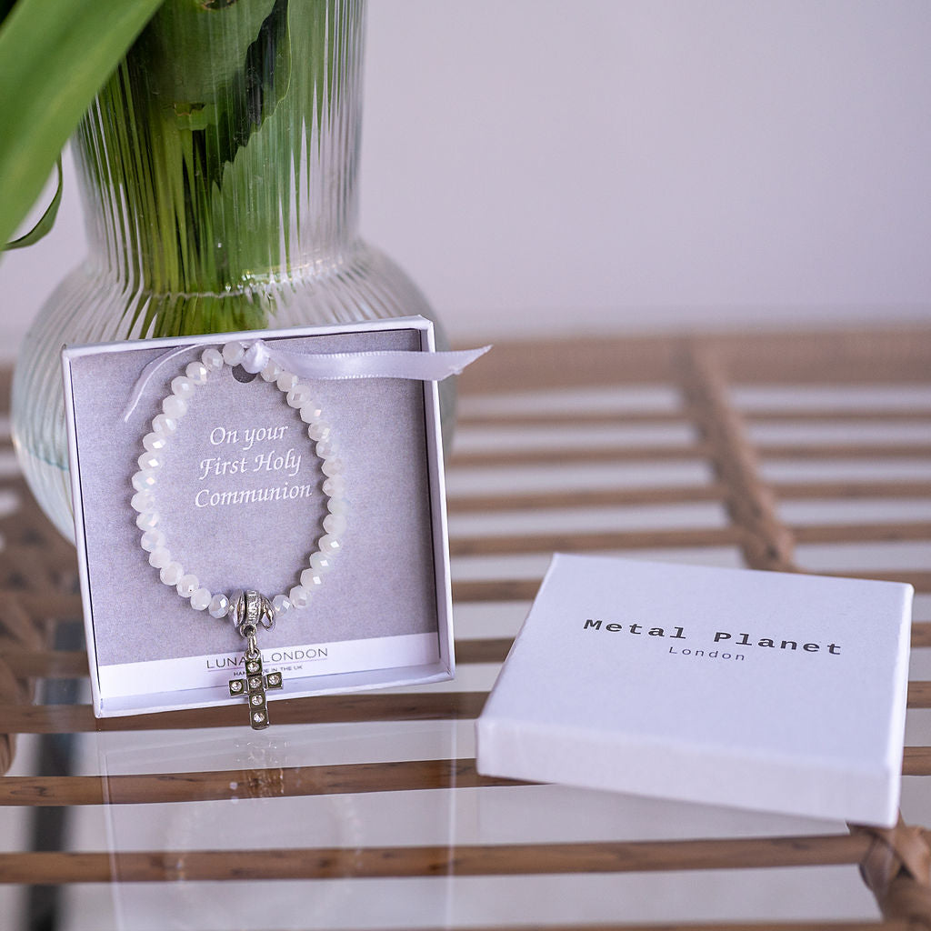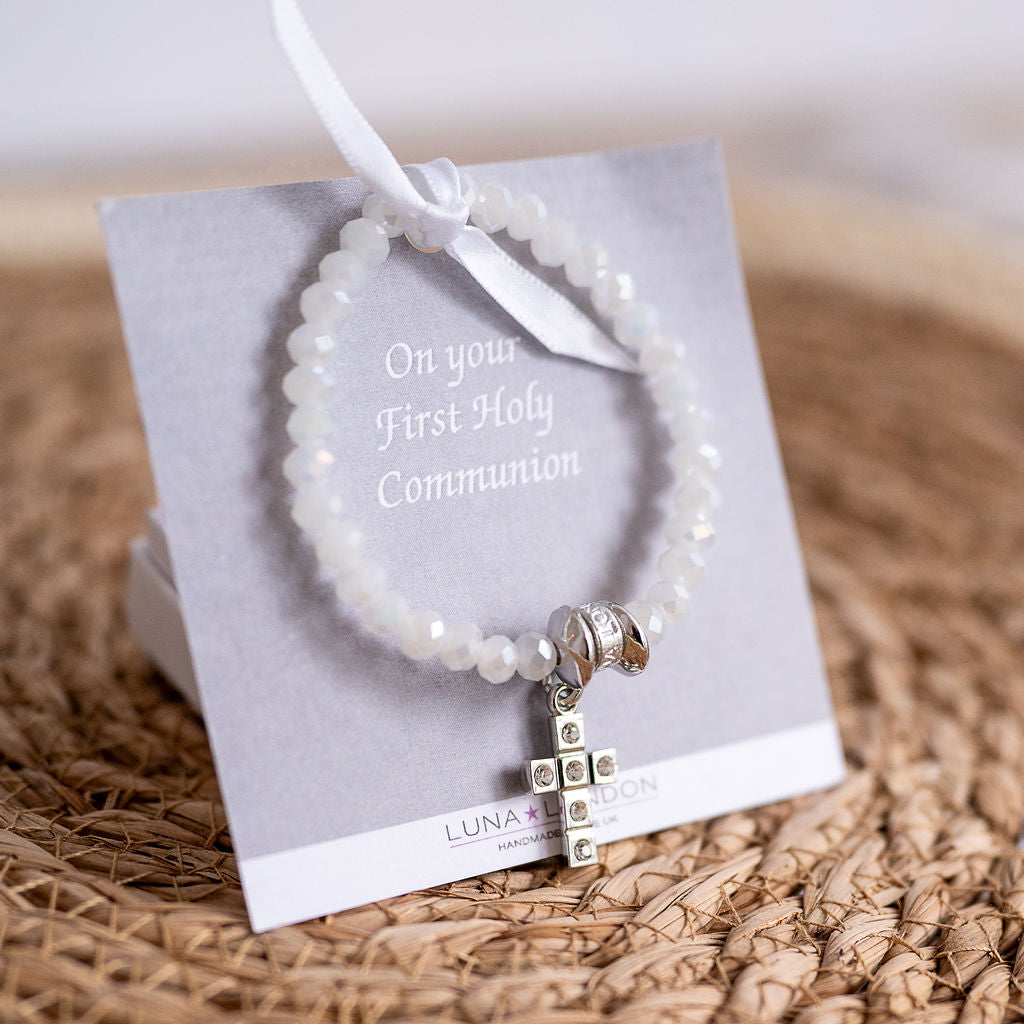 This pretty bracelet is packaged in a smart white box with a printed grey insert card with the words 'On Your First Holy Communion'. The bracelet is tied onto the card with a pretty white satin ribbon.